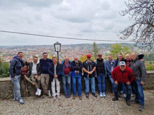 Dem mit rund 180 Hektar Betriebsfläche zweitgrößten Weingut in Deutschland. Unsere Führerin nahm uns an der Vinothek des Juliusspital in Empfang und führte uns danach in die Kelter, Abfüllanlage und die Weinkeller des Geländes. Während der Tour gab es zunächst ein Probierglas für alle Teilnehmende und an drei Stationen je einen Weißwein der Rebsorten Scheurebe, Riesling und Silvaner in das Glas hinein. Im Anschluss an die Weinprobe lagen gerade einmal 200 m Fußweg vor uns, um in der dazugehörigen Weinstube gemeinsam zu Abend zu essen. Den weiteren Abend ließen wir auf der nahegelegenen Alten Mainbrücke bei einem sogenannten Brückenschoppen ausklingen. Am nächsten Morgen begannen wir den Tag mit einer entspannten Panoramafahrt auf dem Main, dem mit 527 km Fließstrecke längsten Nebenfluss des Rheins. Unweit des markanten Alten Kranen bestiegen wir das Fahrgastschiff Alte Liebe. Zunächst fuhren wir Mainabwärts bis nach Veitshöchheim. Währenddessen wurde uns ein vorab bestelltes Weißwurstfrühstück serviert. In Veitshöchheim drehte das Schiff und wir fuhren Mainaufwärts wieder zurück. Nach etwas mehr als 1,5 Std. kamen wir wieder in Würzburg an und gingen von Board. Danach liefen wir binnen einer Viertelstunde zum Vorplatz der Kirche St. Burkard auf der linken Mainseite. Dort trafen wir unseren Stadtführer Joachim für eine kulinarische Stadtführung über den Dächern der Stadt, inkl. 3-Gänge-Menü entlang des Weges. Erstes Ziel war die Wallfahrtskirche Mariä Heimsuchung auf dem Nikolausberg, bekannt unter dem Namen Käppele. Zum Käppele führt ein Treppenaufgang mit 265 Stufen, begleitet von Skulpturen, die den Kreuzweg Jesu darstellen. Nachdem uns Guide Joachim auch das Innere der Kirche gezeigt hatte, ging es hinter dem Käppele ein paar Stufen weiter hinauf zum Nikolaushof mit Panoramablick und einer Pilzcremesuppe als ersten Gang. Wenig später folgte der zweite Gang im nahegelegenen Ausflugslokal Schützenhof. In entspannter Atmosphäre wurde uns Tafelspitz mit Bandnudeln und Meerrettichsoße serviert. Eine gelungene Stärkung vor dem Abstieg hinab über die sogenannten Kniebrecher Treppen zum Kühbach. Unten angekommen ging es auch schon wieder bergauf. Über einen Weinberg führte uns Joachim zur Festung Marienberg, rund 100 Meter oberhalb des Mains. Die aus dem 13. Jahrhundert Stammende Festung befindet sich momentan leider in Restauration. Dafür genossen wir den Ausblick auf Altstadt von Würzburg, bevor es hinab in die Stadt ging. Über die Alte Mainbrücke gelangten wir in die Altstadt. Dort endete unsere geführte Tour im Café Fritzi’s am Mainufer, wo als letzter Gang Waffeln mit Schlagsahne und Apfelmus aufgetischt wurde.Danach legten wir eine kleine Pause ein, bevor wir uns zum Abendessen wieder trafen. Dazu ging es in den Brauerei-Gasthof Alter Kranen, um die Fränkische Küche mit Schäufele oder Haxe zu verkosten. Den weiteren Abend ließen wir gemütlich in einer Kneipe ausklingen. Auch am dritten und letzten Tag wurde es nochmals kulinarisch. Dazu begann der Tag der Männergruppe mit einem halbstündigen und teilweise schweißtreibenden Spaziergang über rund 300 Treppenstufen hinauf zum Schloss Steinburg. Die mittelalterliche Burganlage aus dem 16. Jahrhundert befindet sich inmitten von Weinbergen am Nordrand der Stadt und begrüßte an diesem Vormittag zu einem 3-stündigen Gourmetbrunch. Neben klassischer Auswahl an Aufschnitt und Backwaren gab es auch eine Omelett- und Pfannkuchen Station, sowie Pasta aus dem Parmesanlaib, Roastbeef frisch tranchiert und vieles leckeres mehr. Danach waren wir ausreichend gesättigt und erfreuten uns an einem Verdauungsspaziergang durch die Weinberge. Wir liefen zum Bismarckturm mit Aussicht auf die Stadt und über den Stein-Wein-Pfad zurück zum Würzburger Hauptbahnhof. Bevor wir die Heimfahrt mit der Bahn antraten. Binnen 2 Stunden Fahrt und mit vielen neuen Eindrücken und Erlebnissen ging ein erfolgreicher Vereinsausflug 2025 zu Ende.
